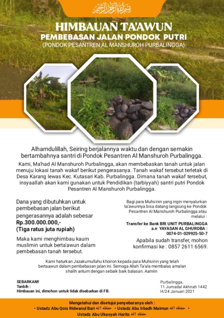 ? Kami, Ma’had Al Manshuroh Purbalingga, akan membebaskan tanah untuk jalan menuju lokasi tanah wakaf berikut pengerasanya. Tanah wakaf tersebut terletak di Desa Karang lewas Kec. Kutasari Kab. Purbalingga. Dimana tanah wakaf tersebut, insyaallah akan kami gunakan untuk Pendidikan (tarbiyyah) santri putri Pondok Pesantren Al Manshuroh Purbalingga.